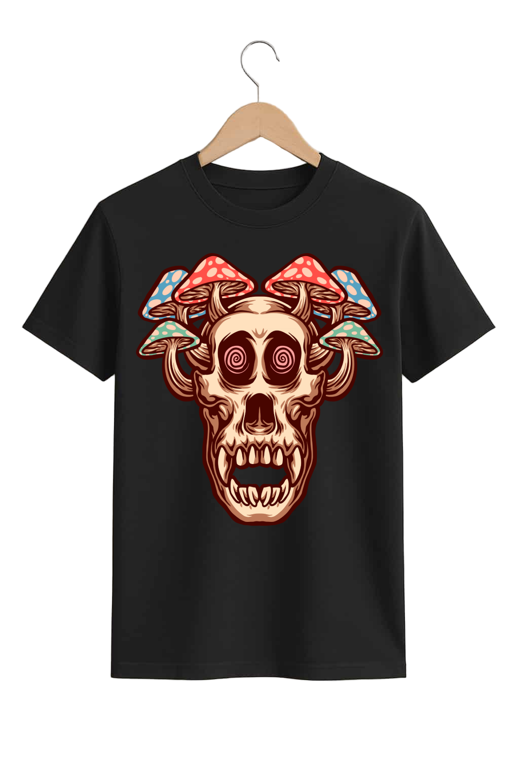 A gorilla skull crowned with red-capped mushrooms and spiral eyes — equal parts primal and surreal. Fierce, funny, and impossible to ignore.